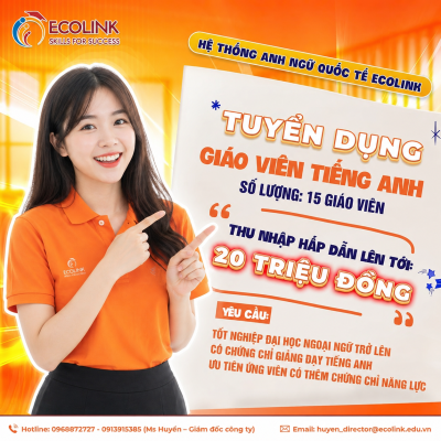 Hệ thống Anh Ngữ Quốc tế Ecolink chuyên đào tạo Tiếng Anh với 100% Giáo viên nước ngoài, trực thuộc Công ty CP Giáo dục và Truyền thông Sức Sống Việt. Sau 9 năm xây dựng và phát triển, với quy mô 11 cơ sở tại các tỉnh thành trên toàn quốc, Hệ thống Ecolink đã đào tạo trên 10.000 lượt Học viên với Lộ trình phát triển 4 kỹ năng Nghe - Nói - Đọc - Viết, giúp các học viên tự tin và sử dụng thành thạo Tiếng Anh.