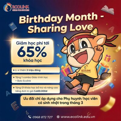 Tháng 3 – tháng của yêu thương và những “ngôi sao” tỏa sáng. Ecolink dành tặng Qúy phụ huynh, khách hàng và học viên có sinh nhật trong tháng này chương trình ưu đãi cực hấp dẫn. Đây không chỉ là món quà sinh nhật ý nghĩa mà còn là thời điểm lý tưởng để......