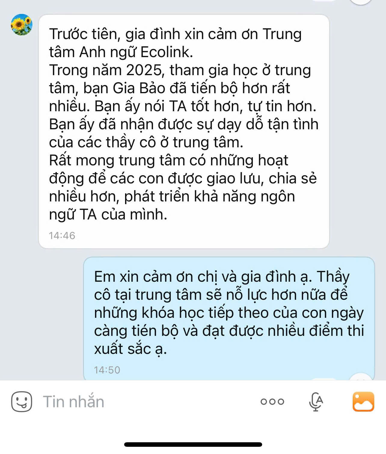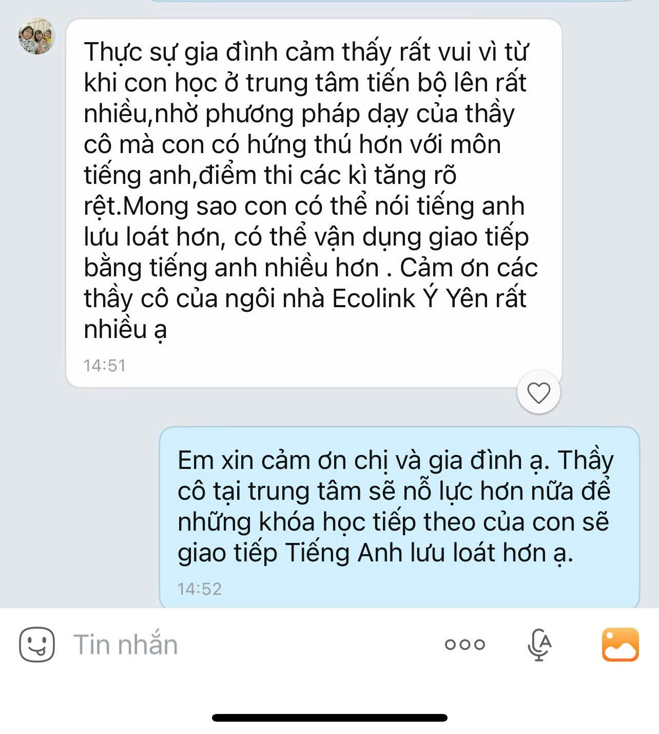 Sự hài lòng và phản hồi tích cực từ phụ huynh chính là minh chứng rõ ràng cho chất lượng đào tạo của Anh ngữ Ecolink. Nhiều học viên sau một thời gian học tập tại trung tâm đã có sự tiến bộ rõ rệt về khả năng giao tiếp và kết quả học tập trên lớp.